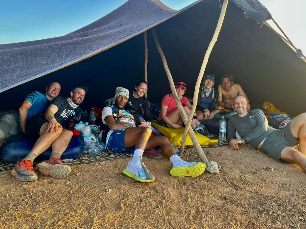 We spent the rest of the afternoon getting to know each other, cracking jokes at other people’s expense (sorry Olly) and sorting out where we were going to sleep. The tents were tiny, though thankfully, there were only seven of us. This was the only positive of Sara not being with us; we would have much rathered she was there. I’m giving the tents way too much credit by calling them that, in reality, they are a black blanket (black is a great colour in a hot desert for reflecting heat…) held up by a few sticks and open to the wind on two sides. On the ground, there is a blanket which gives a little protection from the stony desert, though if you are sensible, you will invest a little time removing as many as possible. It’s a tradition that the first runner home will clear stones each day.